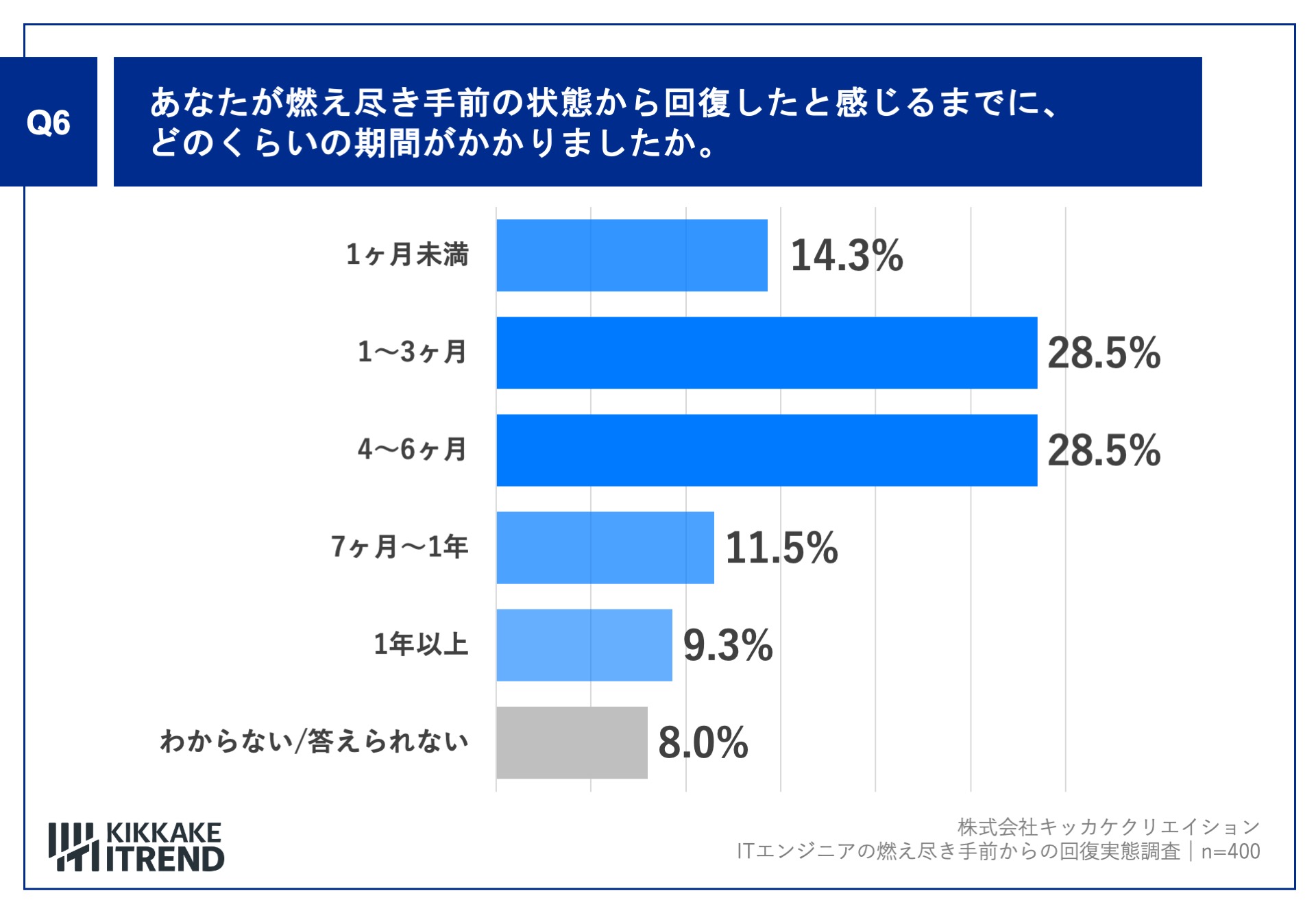 「Q6.あなたが燃え尽き手前の状態から回復したと感じるまでに、どのくらいの期間がかかりましたか。」(n=400)と質問したところ、13ヶ月」が28.5%、「46ヶ月」が28.5%という回答となりました。