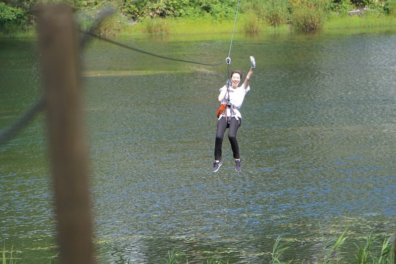 湖の上を滑空するジップスライドならではの高さと開放感が心地よく、風を切って進むスピード感はまるで空を飛んでいるかのような感覚です。高さや開放感を味わいたい方、初心者や体力に自信のない方でもチャレンジでき、所要時間も他のコースに比べると短いので、気軽に楽しんでいただけます。