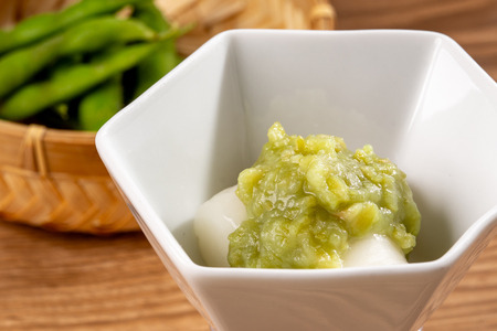 宮城県に古くから伝わる郷土菓子。枝豆をすり潰した「ずんだ」は、戦国時代にまで遡るといわれる伝統の味です。枝豆の香りとやさしい甘さが広がる、和のスイーツに仕上げました。