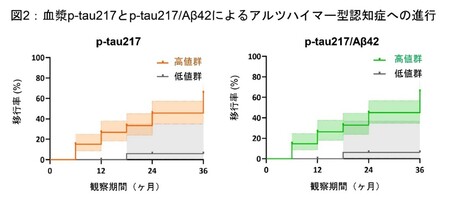 その結果、脳内アミロイドを検出する精度は血漿p-tau217、p-tau217/Aβ42とも非常に高い値を示しました(図1)。血漿中p-tau217が高値を示すMCI群では、低値群と比較して約10倍頻度が高くADに移行しました(図2)。遺伝学的な指標である多遺伝子スコア(ポリジェニックリスク)注5は有意に血漿p-tau217と相関しました。血漿中p-tau217測定値に影響を及ぼしうる交絡因子として、BMI注6、腎機能、HDLコレステロール値が同定されました。