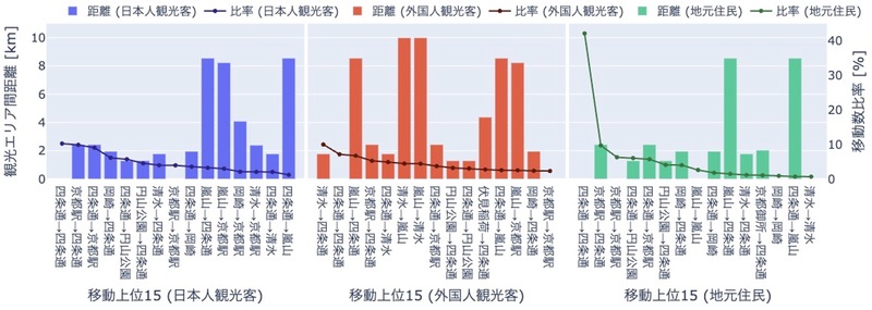 <日本人観光客・外国人観光客・地元住民の移動傾向:外国人観光客は距離の長い移動の割合が多い>