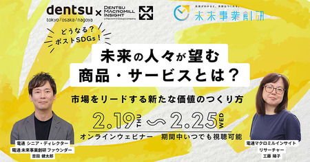 ■【参加者募集】電通×電通マクロミルインサイト 共催ウェビナー「どうなる?ポストSDGs!未来の人々が望む商品・サービスとは? 市場をリードする新たな価値のつくり方」2月19~25日開催