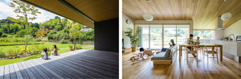 「形だけ、美しさだけでなく、本当に使えるものを提案するのが信条」と谷口。リビングからフラットに、庭のレベルを上げることでその先へ、ウッドデッキが奥行きのある一体感を叶えました。外の景色になだらかにつながり、心が自然と外へ向かう効果も生まれています。