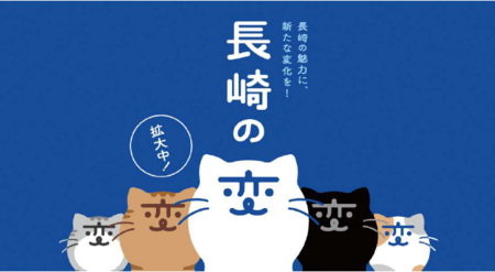 「にゃーが」は本プロジェクトのキャラクターで、長崎のことがとっても大好きな猫。「長崎の変」を起こすことを呼びかけ、魅力発信のお手伝いをしています。シロ、サバトラ、トラ、クロ、ミケの5つのバージョンがあり、一般公募により命名された、「にゃーが・さき・にゃいす・チェンジ・せにゃ・スマイル・きらり・ココ・がんばるにゃん」という長~い本名があります。この名前には「長崎ナイス!チェンジせにゃ!スマイルをきらりとさせて、ここで、がんばろう!」というメッセージが込められています。