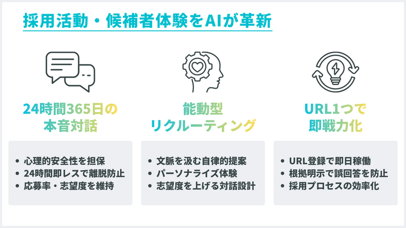 『Recruiteroid』は、これら「人」では解決できなかった物理的・心理的課題を、AIという第三者の立場から突破します。