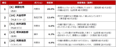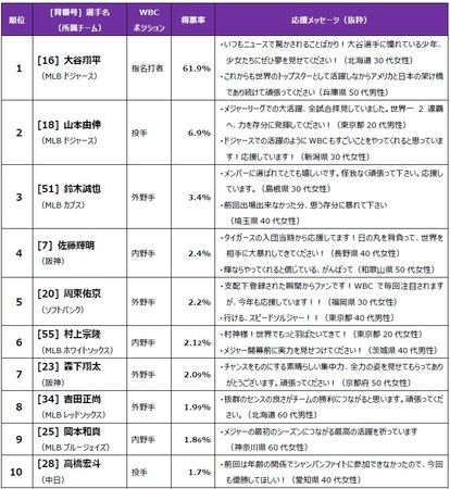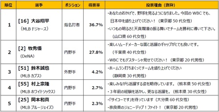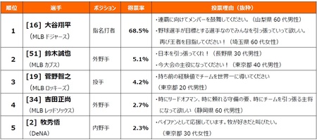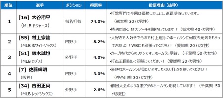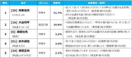 2位は大谷選手のロサンゼルス・ドジャースのチームメイトで、昨年のワールドシリーズMVPにも輝いた山本由伸選手、3位は前回大会を直前の故障により欠場したシカゴ・カブスの鈴木誠也選手、4位は昨年セ・リーグMVP受賞の阪神タイガースの佐藤輝明選手、5位は前回大会の優勝に圧巻の脚力で貢献した福岡ソフトバンクホークスの周東佑京選手でした。
