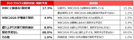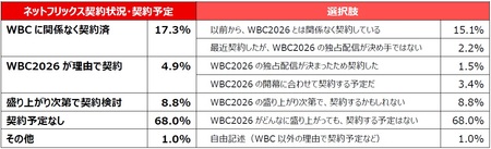「WBCに関係なく契約済」が17.3%、「WBC2026が理由で契約」が4.9%の結果となりました。浮遊層である「盛り上がり次第で契約検討」が8.8%であることから、現状では4.9%+8.8%=13.7%が「WBC2026による新規契約」の最大値として見込まれます。ただし盛り上がりが不十分な場合には4.9%留まりの可能性もあり、逆に大いに盛り上がった場合には「契約予定なし」の回答者が翻意し、13.7%を上回る可能性もあります。