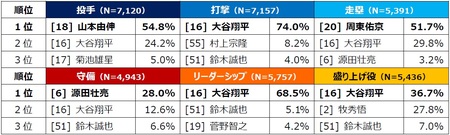 リーダーシップ部門は前回大会決勝アメリカ戦前のミーティングで「憧れるのをやめましょう」の名言でチームを一つにまとめた大谷翔平選手が堂々の1位。2位は大谷選手と同学年で人望の厚い鈴木誠也選手、3位は今大会チーム最年長の菅野智之投手、4位は前回優勝の立役者の一人・吉田正尚選手、5位は横浜DeNAベイスターズが26年ぶりの日本一を決めた2024シーズンにチームの主将を務めた牧秀悟選手でした。