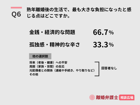 その他の項目は選ばれておらず、熟年離婚後に負担として大きくのしかかるのは、まず経済面、次いで孤独感や精神的なつらさであることが明確に示されました。