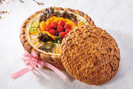 ホームパーティーやお花見におすすめの華やかな一品です。桜柄のパン製バスケットに、 4種類のサンドイッチ(ハム、スモークサーモン、チキンサラダ、カニサラダ)とフルーツを詰め合わせました。