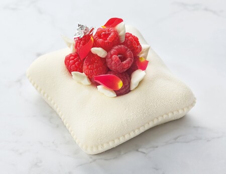 まるで宝石が輝くリングピローのようなホワイトデーシーズン限定のケーキです。甘酸っぱいフランボワーズのジャムとムースを、ホワイトチョコレートムースに閉じ込め、バラの香るジャムを詰めたフランボワーズや花びらを飾りました。大切な方と過ごすひとときに、ロマンティックなムードを演出します。