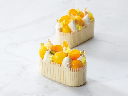 国際女性デーのシンボルカラーにちなみ、黄色を基調に可愛らしく仕上げた、マンゴーのトロピカルな味わいが広がるケーキです。果肉感のあるマンゴーのコンフィチュールとピスタチオ風味の生地を、口どけの良いマンゴーのムースで包み、黄色のエディブルフラワーやチョコレートなどを飾りました。