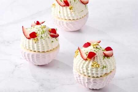 「ヴァシュラン」とは、焼いたメレンゲをクリームやフルーツなどで飾り付けたフランスの伝統的なデザートです。サクサクとした食感のラズベリー風味のメレンゲ生地の中に、甘酸っぱいラズベリーソースを絡めた苺、フランボワーズ、ブルーベリーを閉じ込め、その上に苺の風味豊かなコクのあるクリームを重ねました。上部は生クリームで覆い、ライムの皮や苺、金箔を散らして可愛らしく仕上げました。ベリーのさわやかな酸味と甘みを堪能できるケーキです。