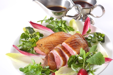 しっとりと仕上げた鴨肉に、爽やかなオレンジソースといちごソースを添えた一皿。果実の酸味と肉の旨みが織りなす、上品な味わいです。