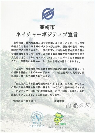 また、同日、内藤久夫市長は「韮崎市ネイチャーポジティブ宣言」を発表しました。