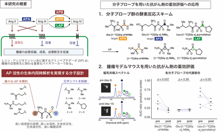 研究グループは、量子化学計算と実験的評価を統合した分子設計戦略により、酵素反応性を担う分子構造要素と、NMR/MRI信号の化学シフトを制御する分子構造要素を分離・最適化しました。その結果、複数の超核偏極MRI分子プローブを同時に使用しても、それぞれの代謝反応を生体内で識別可能な分子プローブ群を開発しました。さらに、これらを用いてモデルマウスの腫瘍内における複数のアミノペプチダーゼ活性の同時検出に成功し、抗血管新生薬スニチニブ治療に伴う酵素活性変化を、腫瘍サイズの変化に先立って検出できる可能性を示しました。