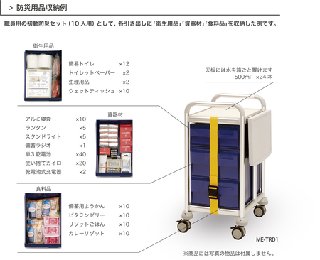 避難所開設を行う担当者用の非常食や物品、マニュアル、名簿等をコンパクトに収納できるカートです。10人分3日間の初動防災品を保管できる容量で、倉庫の目立つ場所、あるいはオフィスの一角に置いておけば、迷わずスピーディーな避難所開設に貢献します。商品の上部には折りたたみ式の作業台が付いており、災害時だけでなく日常的に物品の陳列や筆記台として使うことができます。