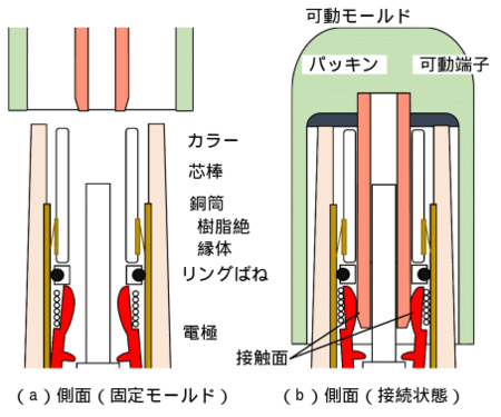 MDS開放時の点検 ・固定モールド基礎部の樹脂バンド(ゴム)に損傷・変形等がないか確認する ・可動モールド内部のパッキンや内壁に異常がないか確認する ・固定モールド外壁や可動モールド内壁に水滴や埃等の付着がないか確認する ・固定モールド外壁に微かな焼損跡やヒビ模様がある場合は、沿面地絡の初期段階である可能性が高いため、更新を推奨する |