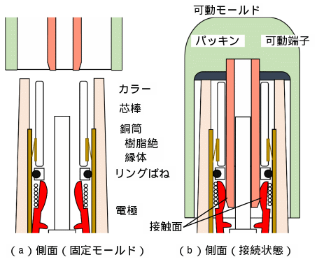 MDS開放時の点検 ・固定モールド基礎部の樹脂バンド(ゴム)に損傷・変形等がないか確認する ・可動モールド内部のパッキンや内壁に異常がないか確認する ・固定モールド外壁や可動モールド内壁に水滴や埃等の付着がないか確認する ・固定モールド外壁に微かな焼損跡やヒビ模様がある場合は、沿面地絡の初期段階である可能性が高いため、更新を推奨する |