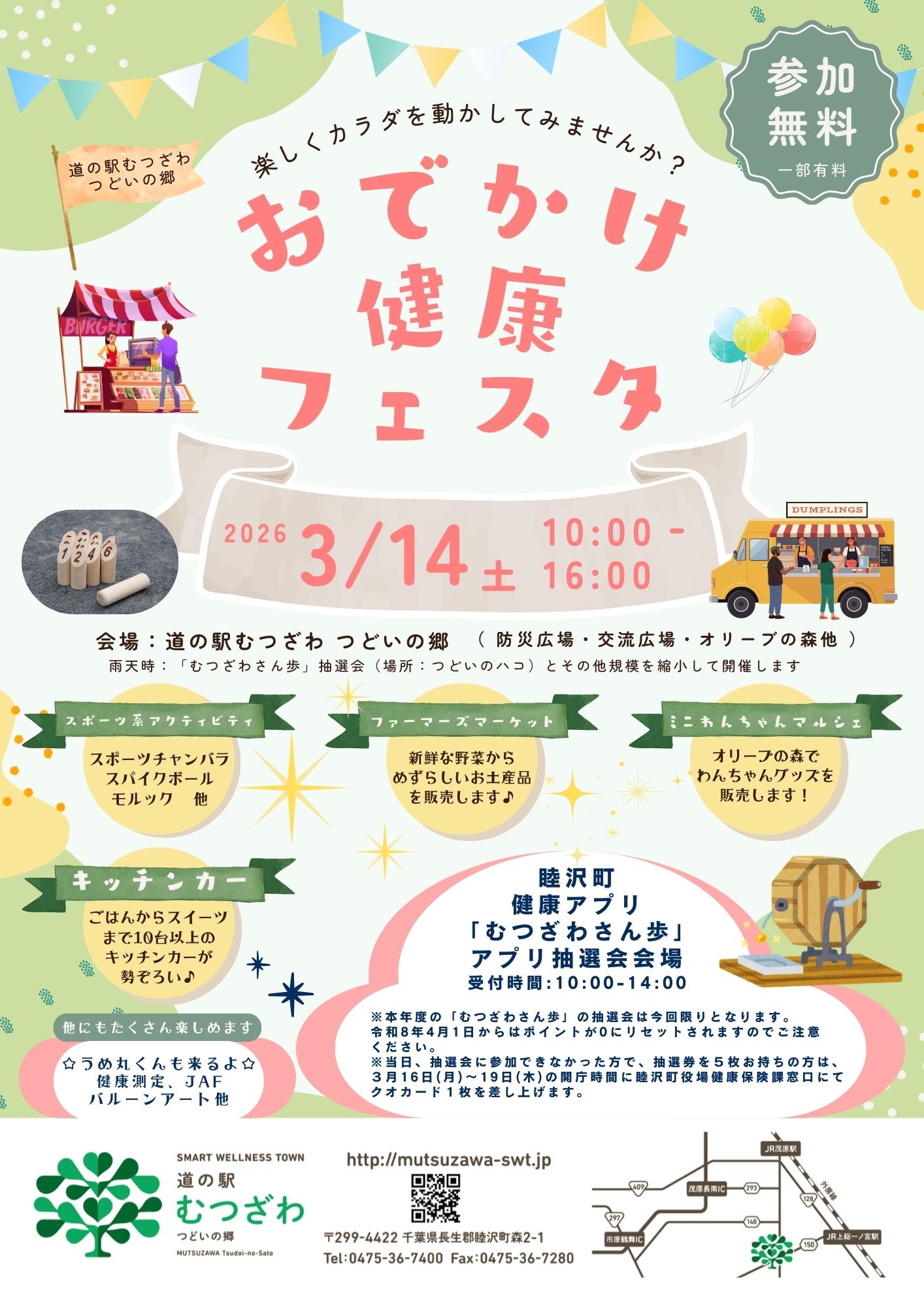 パシフィックコンサルタンツ株式会社(本社:東京都千代田区、代表取締役社長執行役員:大本修)は、「むつざわスマートウェルネスタウン・道の駅・つどいの郷」(千葉県長生郡睦沢町、千葉県道150号大多喜一宮線沿い)と「睦沢町総合運動公園(略称、パークむつざわ)」(千葉県長生郡睦沢町上之郷1565、以下「パークむつざわ」)の運営を通じて、「楽しくカラダを動かす」ことで地域の皆さまの健康増進に貢献する取り組みを行っています。この度、約10種類以上のスポーツ体験ができる過去最大級のスポーツイベント「パークむつざわ スポーツフェスタ」を2026年3月1日(日)に、楽しくカラダを動かし地域の健康を支援するイベント「道の駅むつざわつどいの郷 おでかけ健康フェスタ」を2026年3月14日(土)に開催します。