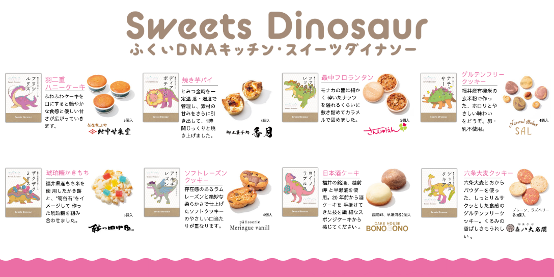 乗車された皆様には、福井県内の菓子店とコラボした恐竜パッケージが目を引くスイ ーツブランド「ふくいDNAキッチンスイーツダイナソー」をお1人様に1個プレゼント(1,500円相当)