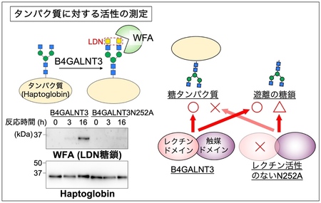 続いて、B4GALNT3のレクチンドメインの役割について調べました。そのために、レクチン機能に不可欠なアミノ酸N252をアラニンに変えたB4GALNT3であるN252Aを精製しました。B4GALNT3が糖鎖を伸ばす活性を測定するため、通常のB4GALNT3とN252Aを、糖タンパク質の一つであるHaptoglobin 12) と反応させました。Haptoglobinの糖鎖の上に合成されたLDNは、WFA 13) と呼ばれるタンパク質を用いて検出しました (図4左上) 。その結果、通常のB4GALNT3では、反応時間に応じてHaptoglobinの糖鎖にLDNが合成されましたが、N252Aではほとんど合成されませんでした(図4左下)。一方で、タンパク質に付いていない遊離の糖鎖に対しては、N252Aは作用できたことから(図4右)、レクチンドメインは、B4GALNT3がタンパク質の上の糖鎖を合成するために不可欠であることがわかりました。