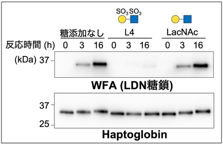 B4GALNT3とHaptoglobinの反応液に、硫酸化された短い糖鎖であるL4、もしくは硫酸化されていない糖鎖であるLacNAcを添加した。B4GALNT3により形成されたHaptoglobinの上のLDNは、WFAタンパク質により検出した。