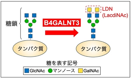 ・B4GALNT3は、タンパク質に付いた糖鎖の末端にLDNと呼ばれる構造を作る酵素で、血中のタンパク質濃度の調節や骨の形成に関わっています。