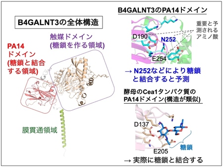 右:B4GALNT3のPA14ドメインの構造と、類似した構造を持つ酵母のCea1タンパク質のPA14ドメインとの構造の比較。Cea1のPA14ドメインは、糖鎖と結合するレクチンであることがすでにわかっている。この構造比較などから、B4GALNT3のPA14ドメインもレクチンであると予測され、糖鎖結合に重要と考えられるいくつかのアミノ酸が推定された。