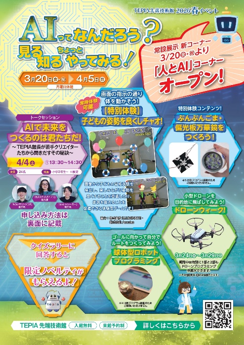 本イベントは、新展示コーナー「人とAI」の公開に合わせ、子どもたちがAIやロボット、プログラミングなどの先端技術を、見て・知って・体験できる内容となっています。期間中は、展示体験に加え、トークセッション、クイズラリー、自由工作、プログラミング体験、TEPIAスタッフや協力団体による特別講座など、多彩なプログラムを実施します。