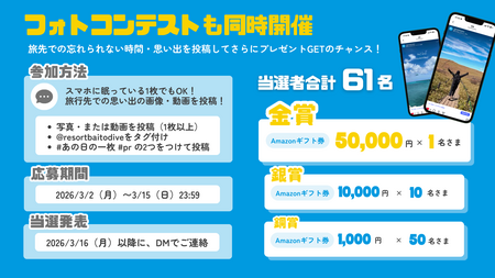 コラボキャンペーン応募者のうち、旅先での思い出写真・動画を投稿いただいた方の中から、選考により豪華賞品を進呈いたします。