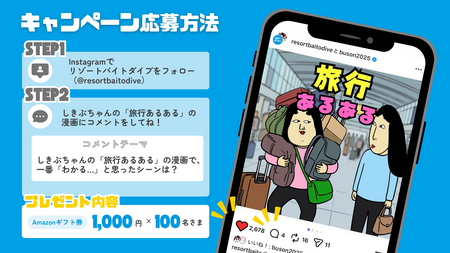 リゾートバイトダイブ公式Instagramアカウントをフォローし、2026年3月2日(月)に投稿されたしきぶちゃんとの共同投稿『旅行あるある漫画』にコメントするだけで応募が完了します。