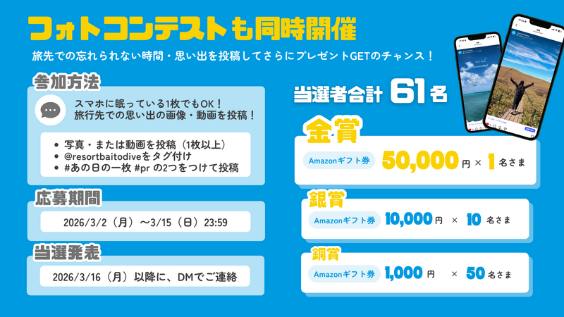 リゾートバイトダイブ公式Instagramアカウントをフォローし、2026年3月2日(月)に投稿されたしきぶちゃんとの共同投稿『旅行あるある漫画』にコメントするだけで応募が完了します。