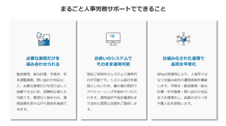 このような状況を受け、近年では業務単位で外部の専門リソースを活用し、運用の安定化を図る企業が増えています。法改正や制度改定に対応しながら業務を安定して継続させるためには、実務を支える運用支援が不可欠となっています。