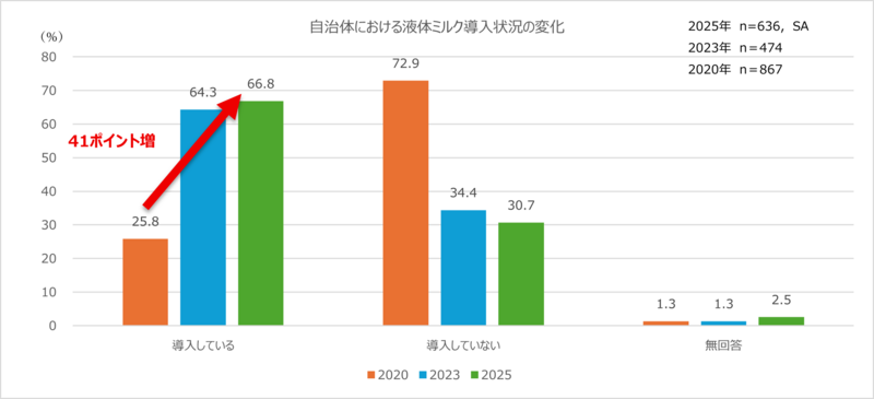 流通備蓄や災害協定による備えも含め、「液体ミルクを何らかの形で確保している」と回答した自治体は全体の約70%にのぼり、2020年と比較すると41ポイント増加した。液体ミルクが乳幼児向け防災備蓄として全国の自治体で浸透しつつある状況が明らかとなった。