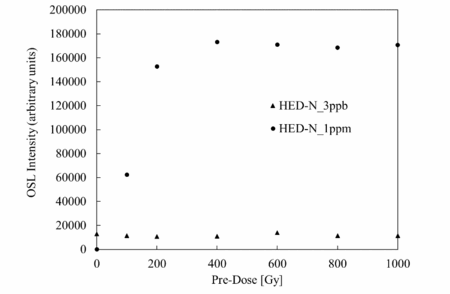 Figure. Dependence of OSL intensity on pre-irradiation dose for HED-N_1ppm (irradiation dose: 10 Gy) and HED-N_3ppb (irradiation dose: 100 Gy). (Journal of Materials Science: Materials in Electronics掲載)