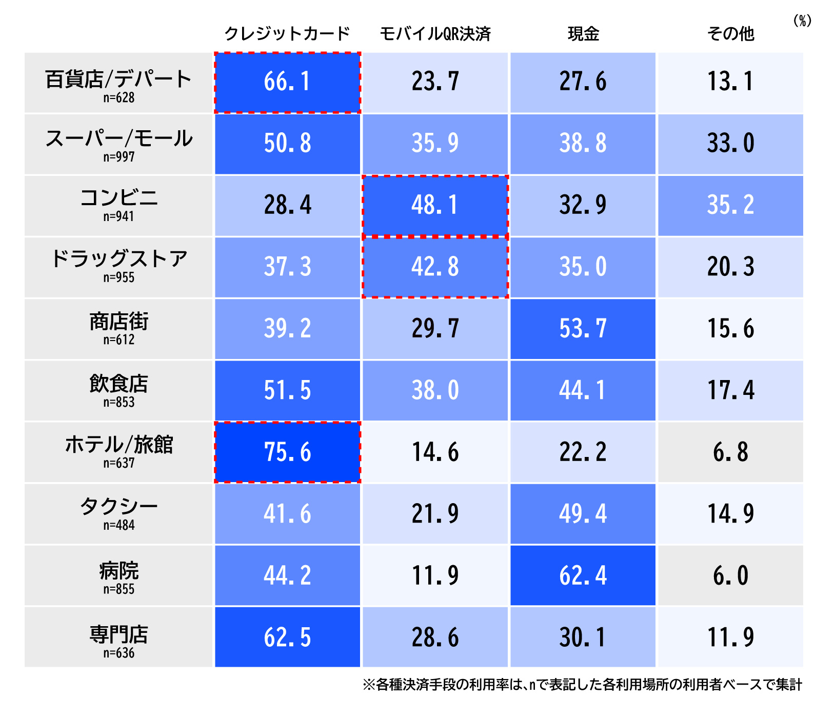 ・実店舗の利用場所別の決済手段について、比較的高額な決済が行われる「百貨店/デパート」(66.1%)、「ホテル/旅館」(75.6%)では「クレジットカード」が高い一方で、日常の買い物など比較的少額な決済が行われる「コンビニ」(48.1%)、「ドラッグストア」(42.8%)では「モバイルQR決済」が高い。【図表6】