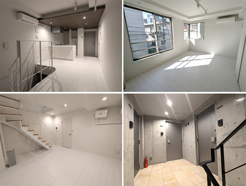 住戸内は白を基調とした内装に、天井材や階段、手すりなどで素材感のアクセントを取り入れています。また、メゾネットタイプの住戸も用意しており、上下階での使い分けによってライフスタイルに応じた多様な住まい方を提案しています。