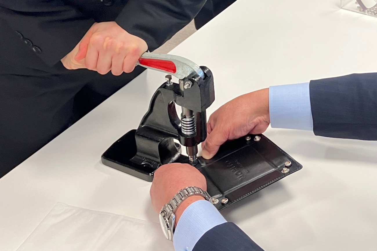 • 役員と新入社員が金属ホックを打ち付ける様子