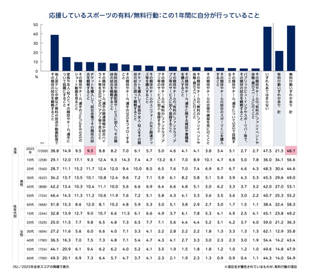 ・スポーツの応援行動のうち、「無料の行動」を行っている人は約5割(48.7%)で、有料行動を行っている人は約2割(21.5%)。有料行動の中で最も高いのは「会場観戦」だが、全体の1割弱にとどまる。【図表8】
