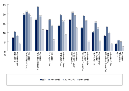 ・ある企業群を認知している人と、それらの企業が主要な大会・リーグなどに協賛していることまで認知している人では、その企業に対する「好意」や商品・サービスの「利用意向」などにおいて、後者の方が約10ポイント高くなり、10~20代ではその差が顕著になった。【図表10】
