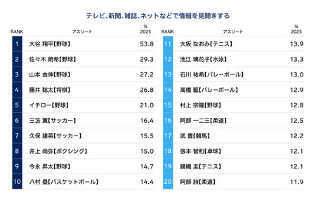 ・「情報を見聞きする選手」 では、大谷翔平が最も多く、山本由伸、佐々木朗希が続き、上位3人はいずれも現役メジャーリーガーとなった。SNSを含め、日常的に情報に触れる機会が多い選手の存在が、競技への興味関心を後押ししている。【図表2】