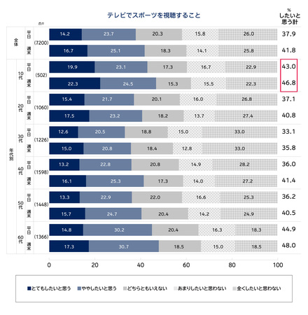 ・また、年代別では「テレビでスポーツを視聴すること」「有料配信サービスでスポーツを視聴すること」「自身がスポーツをすること」の意向は、いずれも10代が平日週末問わず「したいと思う」(「とてもしたいと思う」「ややしたいと思う」の合計)が高く、若年層のスポーツへの関心の高さがうかがえる。【図表5】【図表6】【図表7】