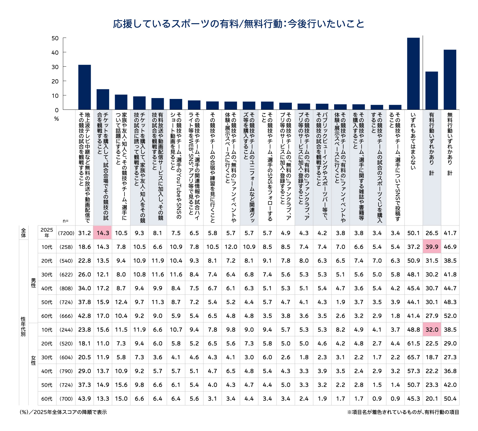 ・「今後チケットを購入して会場で観戦したい」人は14.3%であり、「チケットを購入して会場で観戦した」人(9.5%)よりも高いことから、今後増えていく可能性がある。特に10代男性が有料行動への意向が強く(39.9%)、次に10代女性が続く(32.0%)。若年層を中心に有料行動にシフトする伸びしろが確認された。【図表9】