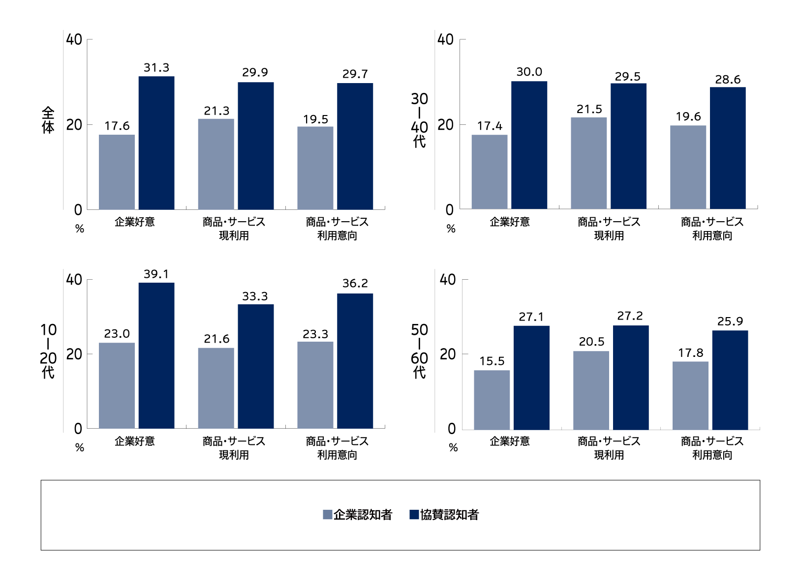 ・ある企業群を認知している人と、それらの企業が主要な大会・リーグなどに協賛していることまで認知している人では、その企業に対する「好意」や商品・サービスの「利用意向」などにおいて、後者の方が約10ポイント高くなり、10~20代ではその差が顕著になった。【図表10】