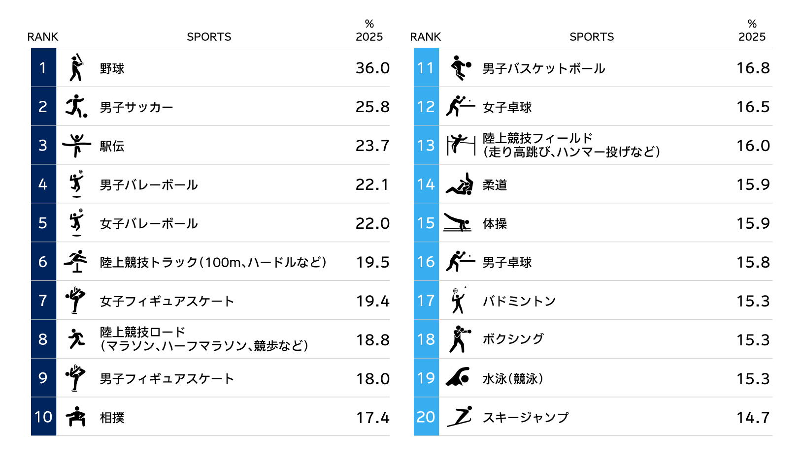 ・「競技の興味関心」では野球が36.0%と高く、男子サッカー25.8%や駅伝23.7%、男子バレーボール22.1%、女子バレーボール22.0%などが続く。【図表1】