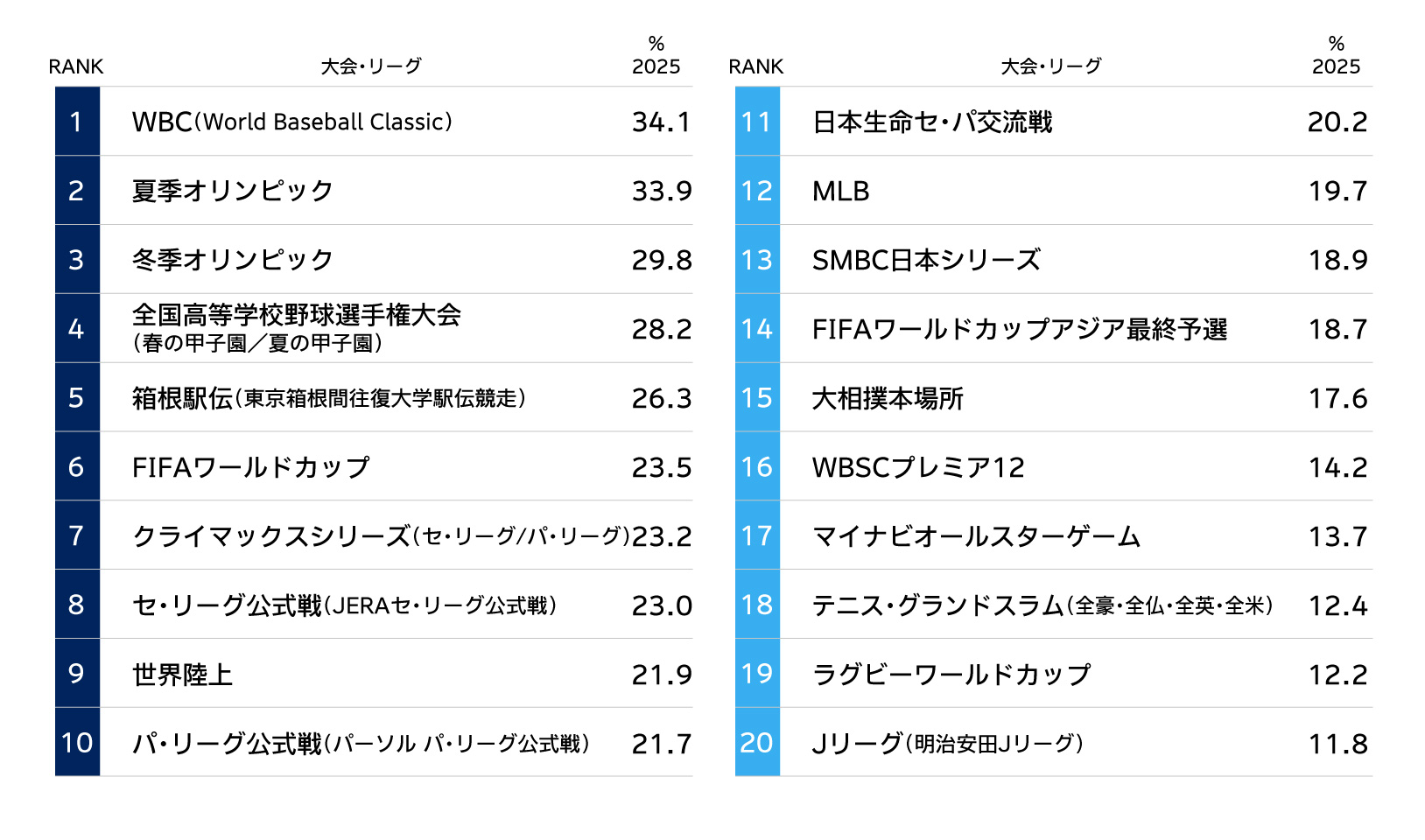 ・大会・リーグの興味関心は、WBC(34.1%)に、夏季オリンピック(33.9%)が続き、冬季オリンピック(29.8%)も3割近く支持されるなど、国際的なメガイベントへの関心の高さが際立つ結果に。次いで高校野球(春/夏28.2%)や箱根駅伝(26.3%)などの国内独自の学生スポーツ大会の関心が高い。【図表3】