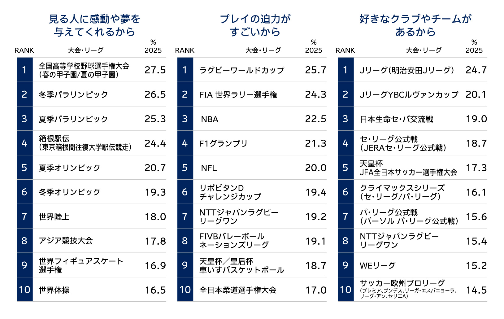・興味の理由をみると、大会・リーグごとに刺さるポイントが異なる。たとえば「見る人に感動や夢を与えてくれる」では高校野球(春/夏)、箱根駅伝に加えて、夏季/冬季パラリンピックが上位に挙がり、社会的な注目度やストーリー性が関心を後押ししている可能性が示唆される。また「プレイの迫力がすごい」ではラグビーワールドカップ、FIA 世界ラリー選手権、NBA(National Basketball Association)が挙がり、競技特性や最高峰のプレイへの期待も関心の入り口となっている。【図表4】
