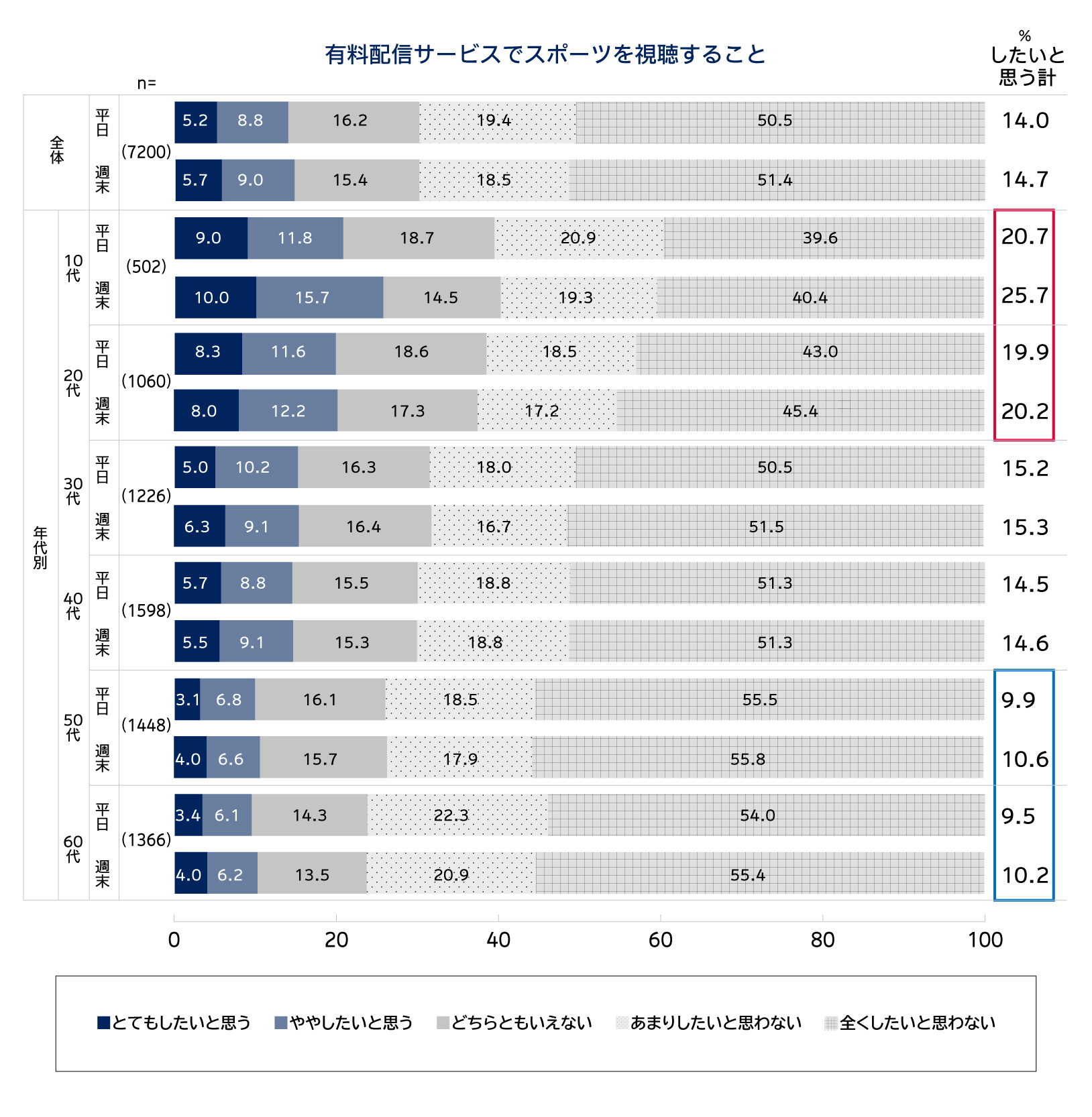Q. 【平日に/週末に】有料配信サービスでスポーツを視聴することについてあなたのご意向をお伺いします。