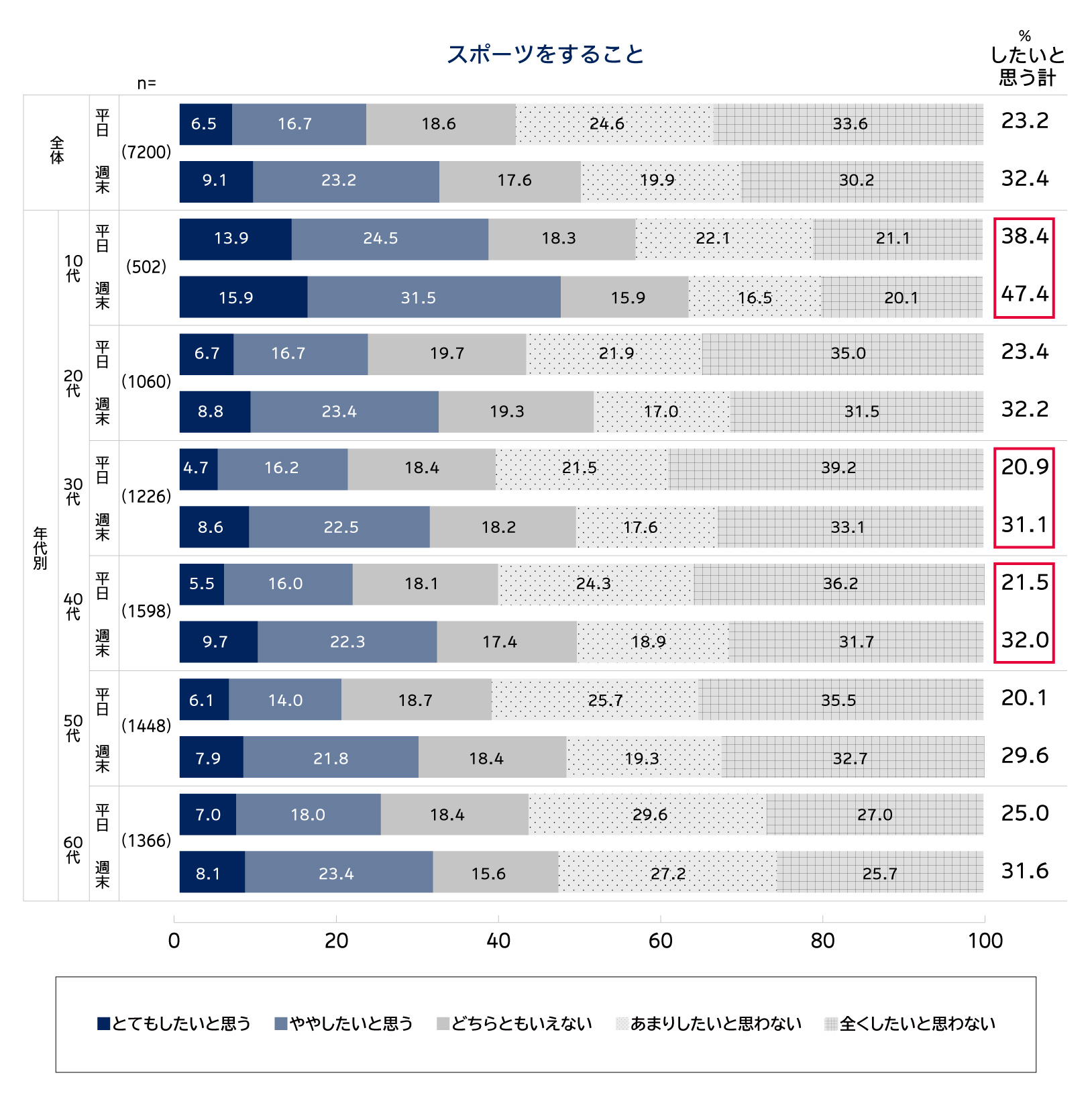 ・一方、「自身がスポーツをすること」(「とてもしたいと思う」「ややしたいと思う」の合計)は平日23.2%/週末32.4%と週末が高い。特に30代(平日20.9%/週末31.1%)、40代(平日21.5%/週末32.0%)では10ポイント以上の開きが生じており、平日の実施ハードルの高さがうかがえる。【図表7】